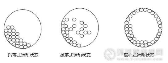 球磨機中研磨體的運動狀態(tài)與筒體的轉(zhuǎn)速和研磨體跟筒體內(nèi)壁的摩擦因素等有關(guān)系。研磨體在筒中的運動狀態(tài)可以分為3種: