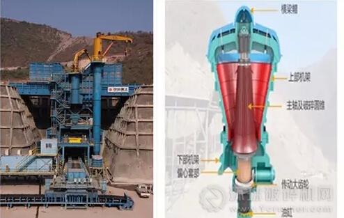 破碎系統(tǒng)中的半移動(dòng)破碎站,采用的是中信重工的旋回破碎機(jī),型號(hào)為PXZ-1500Ⅱ(如圖3),處理量為3500-4500t/h,日處理礦石量92kt/d。旋回破碎機(jī)是利用破碎錐在殼體內(nèi)錐腔中的旋回運(yùn)動(dòng),對(duì)物料產(chǎn)生擠壓、劈裂和彎曲作用,粗碎各種硬度的礦石或巖石的大型破碎機(jī)械。
