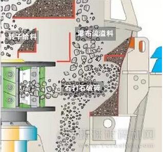 立軸沖擊式破碎機(jī)由進(jìn)料斗、吊架、渦流破碎腔、葉輪體、主軸、底座、傳動(dòng)裝置及電機(jī)部分組成。其工作原理是:物料由進(jìn)料斗進(jìn)入葉輪腔內(nèi)(途經(jīng)吊架處中心進(jìn)料管),由分料錐把物料以傘狀形式均勻地拋于葉輪流道內(nèi),經(jīng)高速旋轉(zhuǎn)的葉輪瞬間加速至 60 — 75 米 / 秒,從葉輪周?chē)牧鞯狼粌?nèi)拋射出去,沖擊到渦流腔內(nèi)渦流襯層上,被物料襯層反彈,斜向沖擊到渦流腔的頂部,又改變其運(yùn)動(dòng)方向,偏轉(zhuǎn)向下運(yùn)動(dòng),和葉輪流道腔內(nèi)拋出的物料形成連續(xù)的物料幕。這樣,一塊物料在渦流破碎腔內(nèi)受到兩次至多次破碎撞擊,被破碎的物料由下部排料口排出,經(jīng)循環(huán)篩分系統(tǒng)形成閉路,一般循環(huán)三次即可將物料破碎成為 4.75mm 以下。這種破碎機(jī)優(yōu)點(diǎn)是破碎比與耐磨襯板的磨損無(wú)關(guān)。由于這種特性,任何物料一無(wú)論其耐磨性能如何都可以很經(jīng)濟(jì)的使用轉(zhuǎn)子離心式破碎機(jī)進(jìn)行破碎,獲得立方型顆粒含量.超過(guò)80%的高質(zhì)量產(chǎn)品。同時(shí)也提高了破碎面的比例。渦流腔內(nèi)部巧妙的氣流自循環(huán),消除了粉塵污染。溢流給料并不需要增加破碎機(jī)的功率消耗和磨損費(fèi)用,溢流給料增加了破碎機(jī)腔內(nèi)部的顆粒密度,更有效的破碎更多的顆粒,提高了能量利用率。