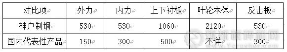 沖擊式破碎機(jī)的使用壽命原來(lái)就比其他類(lèi)型的破碎機(jī)低,如顎式、圓錐式等。而立軸沖擊式又比臥式?jīng)_擊式使用工況更惡劣。因此,機(jī)器零部件的使用壽命,是VSI機(jī)制造商的生命線,在相仿的使用工況下,對(duì)零件壽命作一對(duì)照(見(jiàn)表2.3.1)