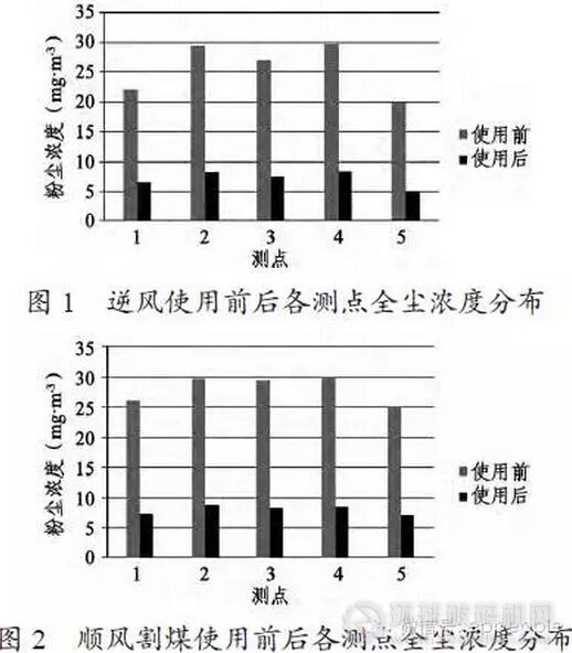 高壓噴霧降塵主要是靠水霧的高壓力來把粉塵沖散,以達到對其濃度進行降低的目的。這種降塵方法的降塵效果比較理想,操作起來也比較簡單,容易實施,它的降塵率可以高達90%左右。它對水的壓力要求控制在8~12MPa以上,對流量的控制要求在15L/min。其工作原理主要是通過高壓力來把水霧分子的飛行速度,還有渦流強度帶電量的大小加以提高,來使水霧分子和粉塵顆粒高速碰撞和凝聚,這樣可以把粉塵外因有空氣膜而出現的排斥現象有效避免,顯著提高兩者的結合度,來達到高效除塵的目的。在采煤機上風側5m至下風側10m內設置五個測點,在逆風割煤和順風割煤兩種情況的全塵分布情況以及采取高壓噴霧除塵技術前后的對比情況如圖1和圖2所示。