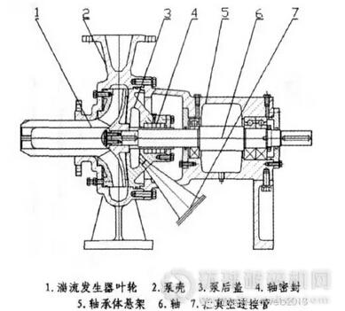 當(dāng)紙漿濃度≥10%時(shí),紙漿中含有大量的空氣,紙漿隨帶湍流發(fā)生器葉輪高速旋轉(zhuǎn)時(shí),由于離心力作用,在葉輪中心形成低壓,紙漿中的空氣與纖維發(fā)生分離并向低壓區(qū)聚集而形成氣團(tuán),阻礙離心泵的吸入性能。因此,必需在真空抽氣系統(tǒng)作用下,及時(shí)把聚于葉輪中心的空氣排出,才能使離心泵能正常工作。