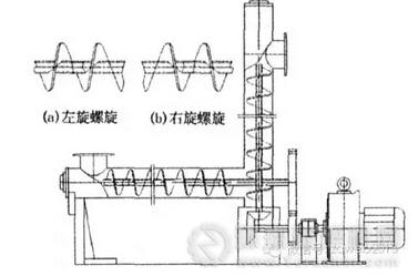 根據(jù)螺旋旋轉(zhuǎn)方向分為左旋和右旋兩種旋向,根據(jù)安裝形式及物料輸送需要分水平固定式輸送螺旋和垂直式輸送螺旋。水平固定式螺旋的傾角β≤20°,輸送長(zhǎng)度一般小于40m;而垂直螺旋一般只用于短距離提升物料,輸送高度一般小于8m,螺旋葉片實(shí)體螺旋面型,且必須有同直徑的水平螺旋喂料,且水平螺旋的轉(zhuǎn)速低于垂直螺旋。