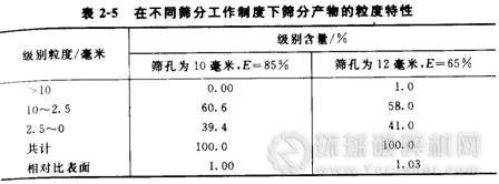 篩分過程是不平衡的,“難篩顆粒”通過篩孔慢,細(xì)粒通過篩孑L快,由于這種不平衡,就可以利用加大篩孔尺寸、降低篩分效率的辦法來提高篩子的生產(chǎn)率。例如,短頭圓錐式破碎機(jī)和篩子構(gòu)成閉路破碎中硬礦石時(shí),破碎機(jī)固定排礦口為10毫米,檢查篩分有兩種不同的工作制度:①篩孑L為10毫米,總篩分效率為85%;②篩孔為12毫米,總篩分效率為65%。實(shí)際上這兩種工作條件所得到的篩下產(chǎn)物有著等值的比表面,即相同的平均粒度(表2—5),也就是說,篩下產(chǎn)物對(duì)碎礦而言是“等值”的,也叫“等值篩分”。