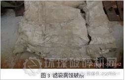 濾袋測(cè)試顯示PH值為5.64,呈較強(qiáng)的酸性,對(duì)除塵器煙氣進(jìn)行測(cè)試,煙氣中硫氧化物含量達(dá)1247mg/m3。進(jìn)一步了解到該除塵器運(yùn)行初期進(jìn)風(fēng)溫度波動(dòng)較大,有時(shí)溫度低到80~90℃。也就是說(shuō)有時(shí)在遠(yuǎn)低于酸露點(diǎn)的溫度下工作,所以濾袋受到了強(qiáng)烈的酸腐蝕作用,使得強(qiáng)力迅速降低,或者說(shuō)濾料在酸露點(diǎn)上、下反復(fù)穿梭,往往進(jìn)一步加快了濾料破損的過(guò)程,見(jiàn)照片。