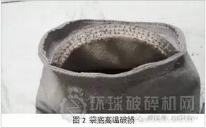 濾袋底部磨損:濾袋底部外側(cè)磨損:破損表面有明顯磨損痕跡,底部縫紉線、濾料基布被磨斷,嚴(yán)重時(shí)袋底破損或整體脫落。這類磨損是由于灰斗內(nèi)料位過(guò)高,氣流揚(yáng)起塵粒直接沖刷袋底,造成磨損。通過(guò)加大灰斗卸灰量、調(diào)整除塵器灰斗卸灰工作制度,避免粉塵堆積過(guò)高,可避免灰斗內(nèi)形成渦流磨損濾袋。