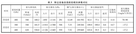 除塵設(shè)備改造前后相關(guān)參數(shù)對比見表3。