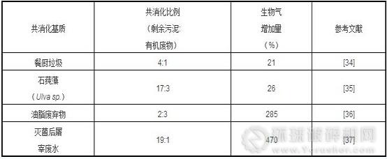污泥共消化發(fā)揮了基質(zhì)間的協(xié)同作用,提高了底物的降解速率和降解程度,使能源轉(zhuǎn)化效率顯著提高。表1列出了幾種不同外源有機(jī)廢棄物與剩余污泥共消化后呈現(xiàn)出的能量轉(zhuǎn)化效果,剩余污泥與其它有機(jī)廢棄物共消化潛力可見一斑。