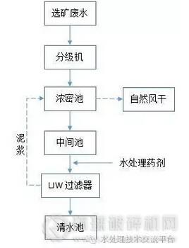 從車間出水的選礦廢水首先流入分級(jí)機(jī)去除大部分粗砂,分級(jí)機(jī)溢流液自流到濃密池,在濃密池進(jìn)一步沉淀后自流入中間池,中間池里的廢水通過(guò)管道泵抽進(jìn)LJW過(guò)濾器,在過(guò)濾器前加入水處理藥劑進(jìn)行輔助過(guò)濾器,過(guò)濾器出來(lái)的清水無(wú)色透明完全可以回用于生產(chǎn);過(guò)濾器底部每隔一段時(shí)間會(huì)排放少量泥漿回流到濃密池,這樣泥漿中殘留的藥劑也能得到充分回收利用,濃密池底部排出的泥漿流到自然干化池風(fēng)干然后運(yùn)走。