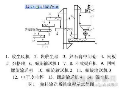提升機、供料螺旋輸送機、回料螺旋輸送機、計量電子皮帶秤、混合螺旋輸送機、收塵器和收塵風機等組成,該熟料輸送系統(tǒng)流程示意簡圖如下所示。