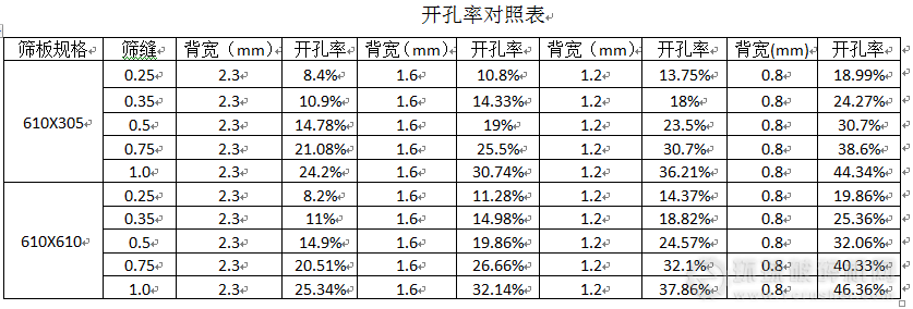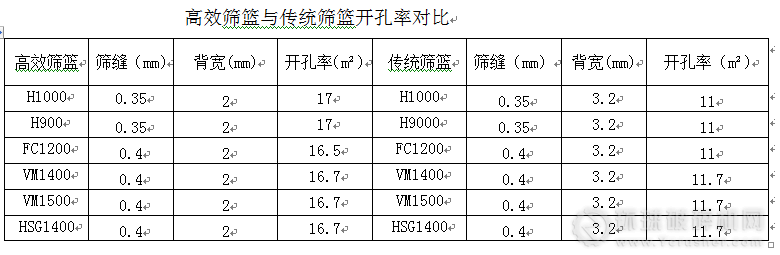 新型高效弧形篩板具有開孔率高、重量輕、耐磨性好、壽命高等優(yōu)點,特別是開孔率較傳統(tǒng)的開孔率提高1倍以上(開孔率對比見下表1),脫水脫介效果好。對于振動弧形篩,安裝高效弧形篩板后,不開振動電機,脫水效果也能達到工藝要求,從而可以降低介耗、電耗。篩板重量變輕也便于更換,減輕了工人更換時的勞動強度,降低篩機負荷,并延長篩機使用壽命。