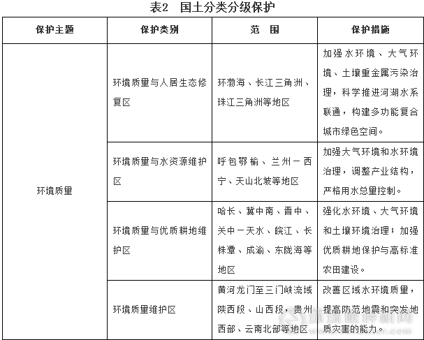 以資源環(huán)境承載力評(píng)價(jià)為基礎(chǔ),依據(jù)主體功能定位,按照環(huán)境質(zhì)量、人居生態(tài)、自然生態(tài)、水資源和耕地資源5大類資源環(huán)境主題,區(qū)分保護(hù)、維護(hù)、修復(fù)3個(gè)級(jí)別,將陸域國(guó)土劃分為16類保護(hù)地區(qū),實(shí)施全域分類保護(hù)。