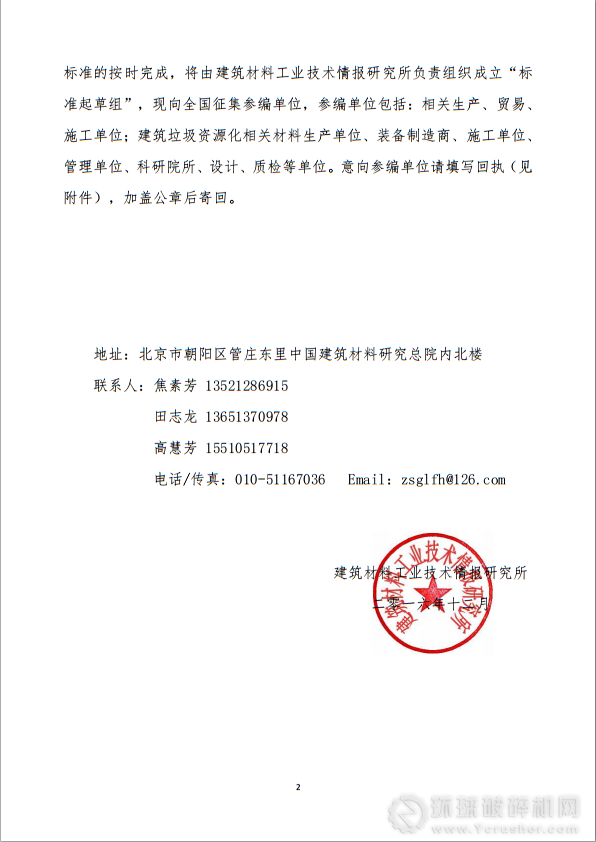 為使制定標(biāo)準(zhǔn)的內(nèi)容更加科學(xué),具有廣泛的適用性和代表性,保證標(biāo)準(zhǔn)的按時完成,將由建筑材料工業(yè)技術(shù)情報研究所負(fù)責(zé)組織成立“標(biāo)準(zhǔn)起草組”,現(xiàn)向全國征集參編單位,參編單位包括:相關(guān)生產(chǎn)、貿(mào)易、施工單位;建筑垃圾資源化相關(guān)材料生產(chǎn)單位、裝備制造商、施工單位、管理單位、科研院所、設(shè)計(jì)、質(zhì)檢等單位。意向參編單位請?zhí)顚懟貓?zhí)(見附件),加蓋公章后寄回。