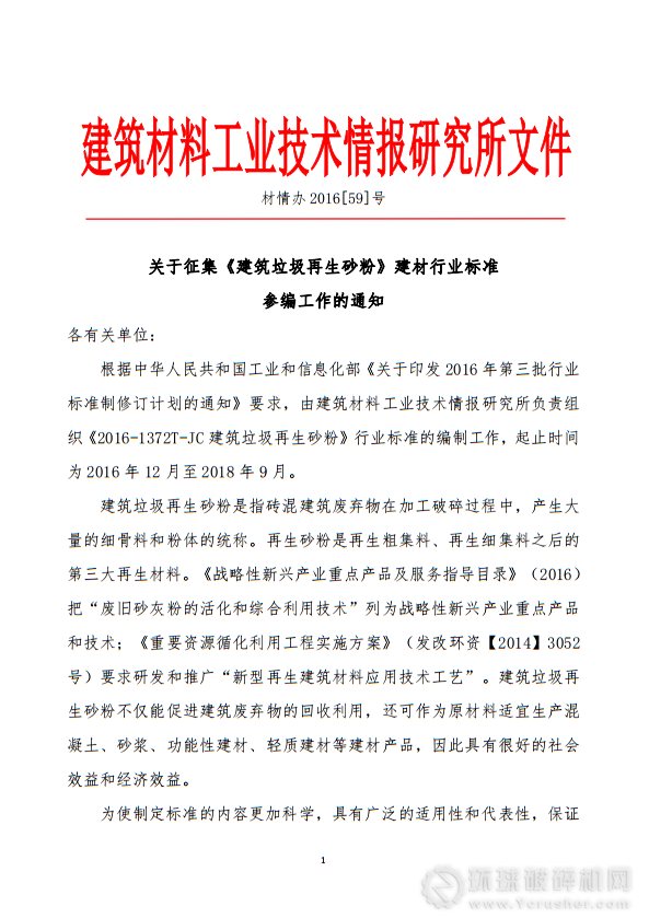 根據(jù)中華人民共和國工業(yè)和信息化部《關(guān)于印發(fā)2016年第三批行業(yè)標(biāo)準(zhǔn)制修訂計(jì)劃的通知》要求,由建筑材料工業(yè)技術(shù)情報研究所負(fù)責(zé)組織《2016-1372T-JC建筑垃圾再生砂粉》行業(yè)標(biāo)準(zhǔn)的編制工作,起止時間為2016年12月至2018年9月。