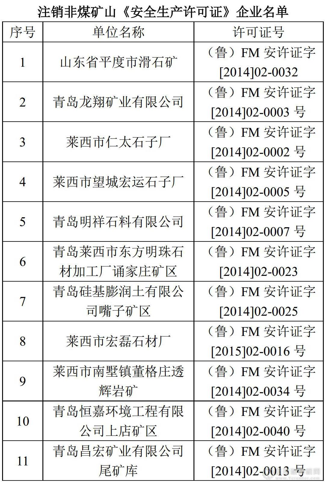 平度市滑石礦、硅基膨潤(rùn)土礦等11家礦山被注銷安全生產(chǎn)許可證!