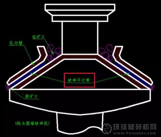 平行碎礦區(qū)是圓錐破碎機(jī)粒度均勻的保證區(qū)域。破碎能力與平行區(qū)的料層厚度有關(guān),料層厚度和排礦口的大小也有直接的關(guān)系。平行區(qū)長(zhǎng)度增加,有利于粒度的控制,但排礦能力相對(duì)減小;平行區(qū)長(zhǎng)度減小,有利于排礦,但碎礦粒度不易保證。