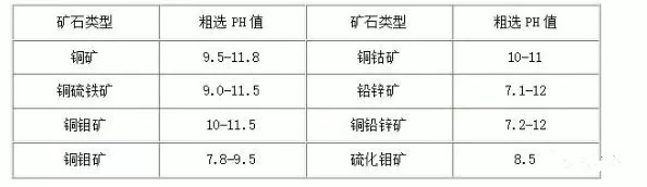 在接觸曲線中介紹,在一定的藥劑濃度下,調(diào)節(jié)礦漿的PGH值可以使礦物到抑制或順利進行浮選。因此,為了使藥劑充分發(fā)揮效能,控制藥劑與礦物表面的作用,使浮選過程順利進行,浮選時,在對礦漿的PH值進行適當(dāng)調(diào)節(jié)。各種礦石分選時,時過境遷其比較適宜的PH值范圍。根據(jù)長期生產(chǎn)實踐的經(jīng)驗,常見硫化礦浮選的PH值見下表: