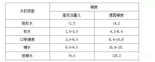 各國要用硬度的計算標(biāo)準(zhǔn)各不相同,有德國硬度,美國硬寬,法國硬度,英國硬度等,還有采用毫磢當(dāng)量硬度,1毫克當(dāng)量硬度相當(dāng)于1L水中含有20毫克的鈣離子,或12.16毫克的鎂離子。經(jīng)換片,1毫克當(dāng)量硬度=2.804德國硬度=50.045美國硬度=5法國硬度。水的軟梗等級見下表: