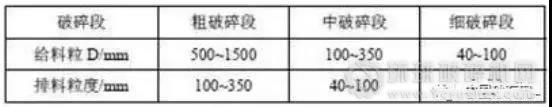 根據(jù)所需成品不同,一個(gè)破碎流程可分為粗破碎段、中破碎段、細(xì)破碎段及磨破段,經(jīng)過(guò)各破碎段進(jìn)料和破碎后產(chǎn)品粒度范圍如下表: