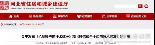 2019年4月23日,河北省住房和城鄉(xiāng)建設(shè)廳發(fā)布公告,河北省地方標(biāo)準(zhǔn)——《機(jī)制砂應(yīng)用技術(shù)標(biāo)準(zhǔn)》正式發(fā)布,8月1日起實(shí)施。