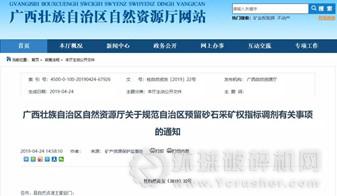 4月24日,廣西自然資源廳發(fā)布通知,要求規(guī)范自治區(qū)預(yù)留砂石采礦權(quán)指標(biāo)調(diào)劑。《通知》規(guī)定,申請自治區(qū)預(yù)留砂石采礦權(quán)指標(biāo)必須符合以下條件之一: