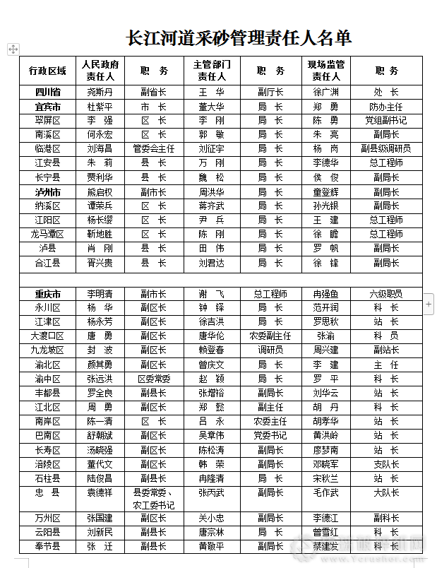為了促進(jìn)長江采砂管理工作,有效落實長江采砂管理責(zé)任制,長江沿線各地確定了采砂管理各河段河長和各級人民政府、水行政主管部門、現(xiàn)場監(jiān)管及行政執(zhí)法責(zé)任人名單,特向社會公告。