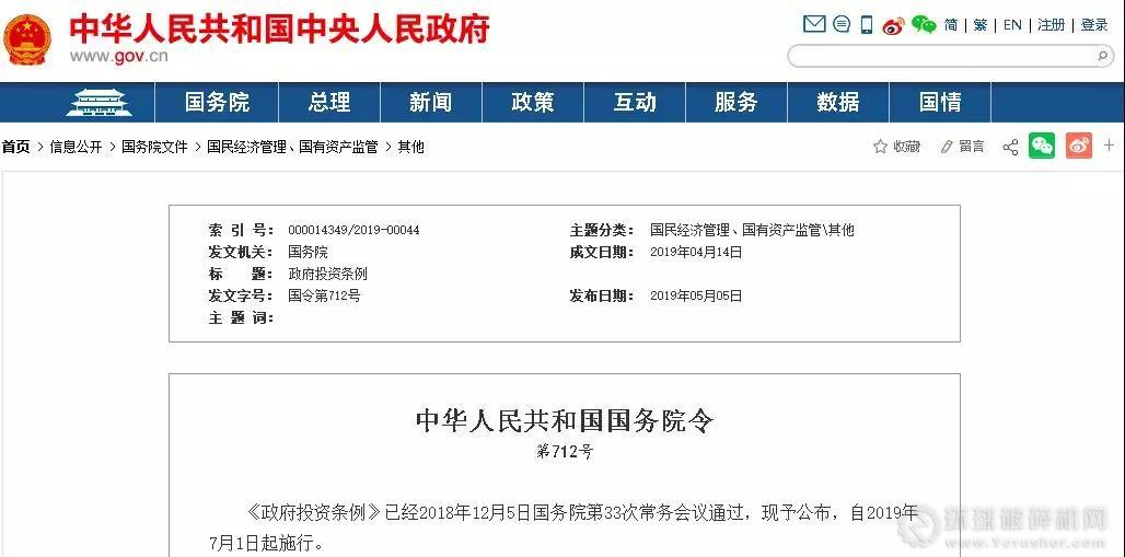 《政府投資條例》已經(jīng)2018年12月5日國(guó)務(wù)院第33次常務(wù)會(huì)議通過(guò),現(xiàn)予公布,自2019年7月1日起施行。