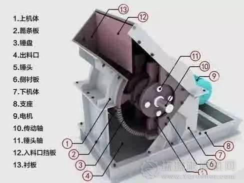 錘破由轉(zhuǎn)子、錘頭、錘架、銷軸、機(jī)架、反擊板、篩板、傳動部件等組成,反擊板位于轉(zhuǎn)子的正前方,上下破碎腔水平中心線以上,它是破碎機(jī)上腔的組成部分之一。反擊板由板體及裝在其上的若干齒形破碎