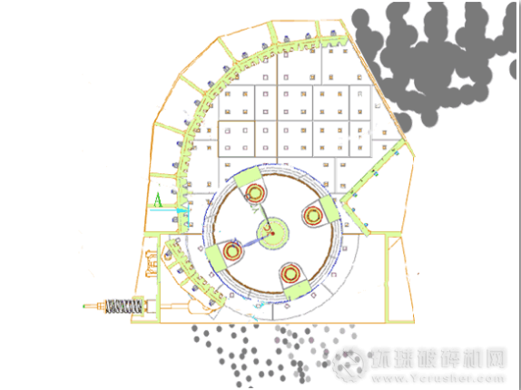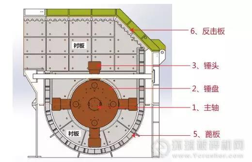 破碎機(jī)中,即受到高速旋轉(zhuǎn)的錘頭沖擊。小塊物料受沖擊被破碎,并從錘頭處獲得動(dòng)能,以高速向反擊板6沖擊而遭第二次破碎。