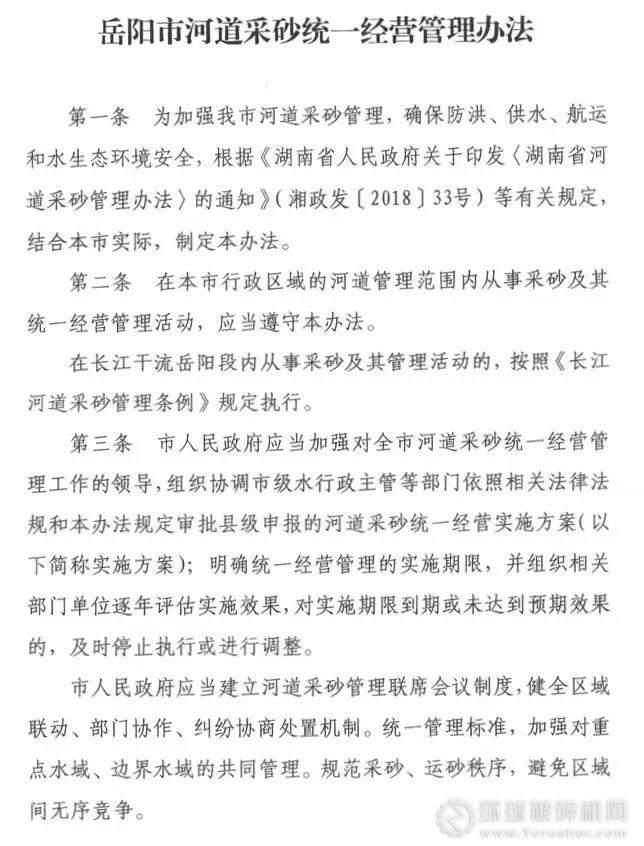 日前,《岳陽市河道采砂統(tǒng)一經營管理辦法》正式發(fā)布,該市河道采砂統(tǒng)一國營有了法規(guī)依據(jù)。