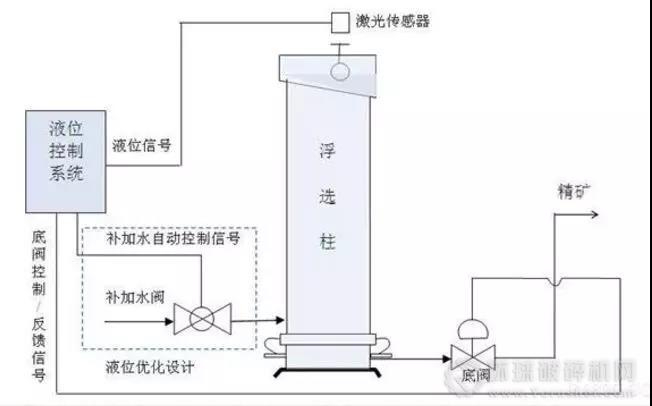3)浮選槽液位自動(dòng)控制。在選礦生產(chǎn)過(guò)程中,準(zhǔn)確控制浮選槽液位和充氣量,保持液面穩(wěn)定,不但能穩(wěn)定浮選作業(yè),而且有利于提高有用礦物的品位和回收率等浮選指標(biāo)。在浮選作業(yè)中,對(duì)浮選槽液位和充氣量進(jìn)行控制一直是個(gè)難題,目前國(guó)內(nèi)大多采用間接測(cè)量的方法。近年來(lái)在浮選槽檢測(cè)礦漿液位時(shí),多采用浮子式液位變送器,也有的采用超聲波測(cè)量浮球位移的浮選槽液位計(jì)。浮選柱沒(méi)有劇烈攪拌,可通過(guò)間接測(cè)量法測(cè)得液位的實(shí)際高度,通過(guò)調(diào)節(jié)尾礦閥的開(kāi)度或泵的轉(zhuǎn)速,控制尾礦量的排出,達(dá)到穩(wěn)定液位的目的。