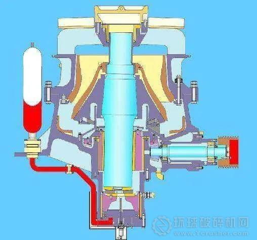 破碎腔或因某種原因機(jī)器超載時(shí),液壓保險(xiǎn)系統(tǒng)實(shí)現(xiàn)保險(xiǎn),液壓油注入蓄能器,主軸下墜,排料口增大,異物從破碎腔排出,蓄能器將油壓回,