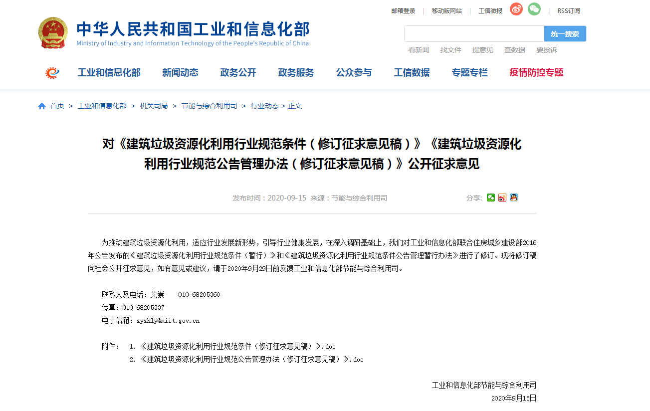 對《建筑垃圾資源化利用行業(yè)規(guī)范條件(修訂征求意見稿)》《建筑垃圾資源化利用行業(yè)規(guī)范公告管理辦法(修訂征求意見稿)》公開征求意見