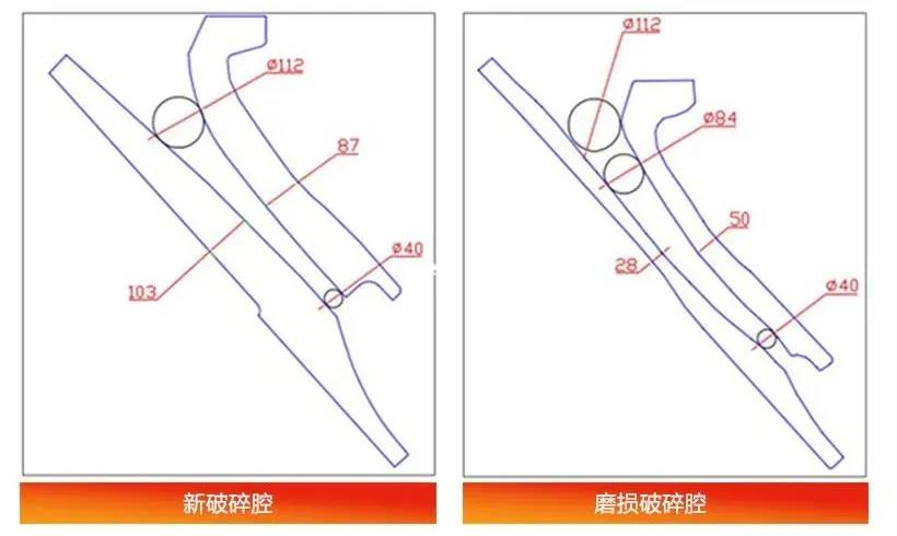 我們通過下面的圖片來了解兩者的不同。圖片顯示了兩種情況下,破碎機(jī)襯板的橫截面圖:左圖是沒有任何磨損的新腔型,而右圖是磨損后的腔型。磨損后的腔型厚度表明,利用率超過50%,因此我們可以評(píng)估襯板更換時(shí)間節(jié)點(diǎn)。注意,兩個(gè)腔型的緊邊排料口(CSS)都保持在40mm。但可以看到,112mm最大給料粒度位于磨損后腔型的破碎區(qū)之外,而磨損后破碎腔的尺寸為84mm。
