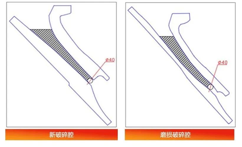為了更好地理解容積能力,下圖展示了兩個(gè)腔型。可以看出,磨損后破碎腔的容積能力有所減小。與新破碎腔相比,容積能力越小的破碎腔,每小時(shí)處理量越低。這是在相同的緊邊排料口(如40mm)條件下進(jìn)行比較。因?yàn)椋绻龃缶o邊排料口,雖然可以增加容積能力,但是會(huì)降低產(chǎn)品質(zhì)量。
