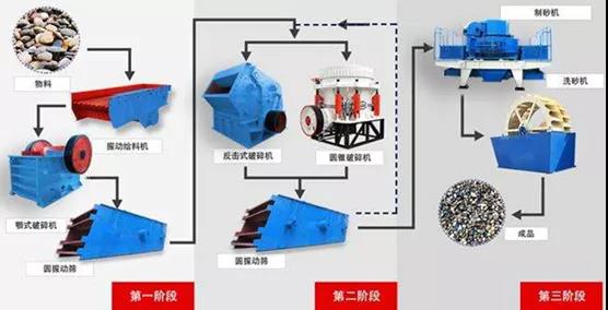細(xì)碎以及超細(xì)碎等環(huán)節(jié),每個環(huán)節(jié)有與之對應(yīng)的加工設(shè)備,通過設(shè)備的運轉(zhuǎn)將石料加工成所需成品的過程稱破碎流程。通常情況下有兩段破碎,三段破碎,四段破碎的工藝,二段和三段較為常用,四段用的很少,主要會出現(xiàn)在大型