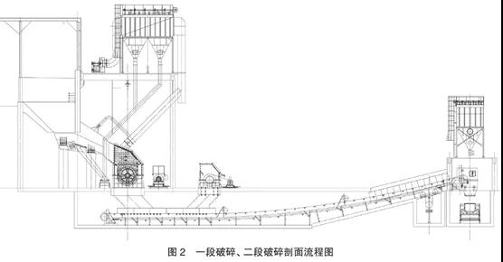 一級(jí)單段錘破(或重錘反擊破)進(jìn)料斗上方處設(shè)集中收塵系統(tǒng)和噴霧降塵系統(tǒng),一級(jí)及二級(jí)破碎機(jī)設(shè)集中收塵系統(tǒng)。一段破碎、二段破碎工藝流程見圖2: