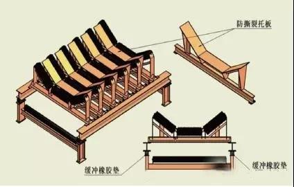 襯板等),一旦落在兩個(gè)托輥之間的膠帶上,就會(huì)將膠帶穿透、割傷,如果不及時(shí)處理,就會(huì)將整條膠帶豁為兩條,這對(duì)大型鋼繩芯膠帶的破壞是致命的。為此,在各個(gè)緩沖托輥之間,設(shè)計(jì)了一種剛性的托板,正常運(yùn)行時(shí)膠帶與托板不接觸,一旦有大塊物料和異物沖擊膠帶,膠帶就會(huì)因?yàn)槭芰ψ冃魏笈c剛性的托板接觸,托板對(duì)物料和鐵器產(chǎn)生反彈,避免物料及異物劃傷膠帶。