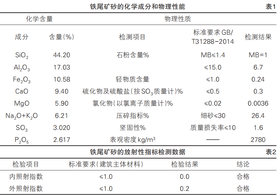 本研究中使用的鐵尾礦砂,來源于安徽省馬鞍山市,其外觀如圖1所示,顏色呈灰黑色,通過篩分析試驗(yàn)測得鐵尾礦砂的細(xì)度模數(shù)為 1.4。按照《鐵尾礦砂》(GB/T31288-2014)標(biāo)準(zhǔn)規(guī)定的試驗(yàn)方法測試了鐵尾礦砂的有害物質(zhì)含量、堅(jiān)固性等指標(biāo),結(jié)果表明這些指標(biāo)符合 GB/T31288-2014的要求。對鐵尾礦砂進(jìn)行理化性質(zhì)分析,測得其化學(xué)成分和相關(guān)物理指標(biāo)如表 1 所示,其放射性指標(biāo)見表 2。鐵尾礦砂的放射性指標(biāo)符合《建筑材料放射性核素限量》(GB6566-2010)的要求。