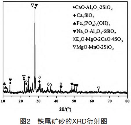 圖 2 是鐵尾礦砂的 XRD 圖譜分析,可以確定該鐵尾礦砂的礦物組成,從XRD 的各個(gè)峰來看,本實(shí)驗(yàn)中所使用的鐵尾礦砂成分較復(fù)雜,多個(gè)物質(zhì)晶相中都有 SiO2,推測該鐵尾礦砂樣品中 SiO2成分含量較多,并且含有 CaO,Al2O3,F(xiàn)e2O3,Na2O,P2O5,MgO,K2O,SO3,MnO等雜質(zhì)。該樣品中含有CaO,沒有C 元素,推測沒有石灰?guī)r成分,CaO·Al2O3·2SiO2 推測可能為長石混合物,Ca2SiO3,Na2O·Al2O3·6SiO2 推 測 可 能為粘土和石英砂混合物,MgO·MnO·2SiO2推測可能均為含有雜質(zhì)的石英砂混合物,K2O·MgO·CaO·4SO3推測可能為含有硫化物成分的雜質(zhì),F(xiàn)e5(PO4)3(OH)5推測可能為少量的磁鐵礦及磷化物的混合雜質(zhì)。