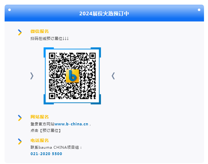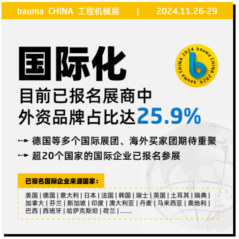 歷經(jīng)四年沉淀,bauma CHINA 2024將于明年11月26-29日強(qiáng)勢(shì)回歸!31萬平米展示面積,預(yù)計(jì)匯聚3000+國(guó)內(nèi)外參展商。目前國(guó)際品牌、國(guó)家展團(tuán)報(bào)名踴躍,行業(yè)急需面對(duì)面溝通交流未來的發(fā)展,bauma CHINA 2024 將在更開放的經(jīng)貿(mào)環(huán)境下,以二十余年自身積淀,深入做強(qiáng)“國(guó)際化”優(yōu)勢(shì),為亞洲工程機(jī)械行業(yè)提供“久違”的實(shí)地挖掘新產(chǎn)品、面對(duì)面采購(gòu)交流、洞察行業(yè)變革的平臺(tái)。